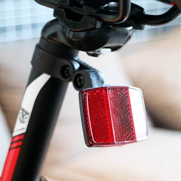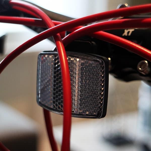 Pyörän mukana tulee myös pari heijastinta. Vaalea heijastin tulee eteen ja punainen taakse. Kuvista näet mistä on kyse.