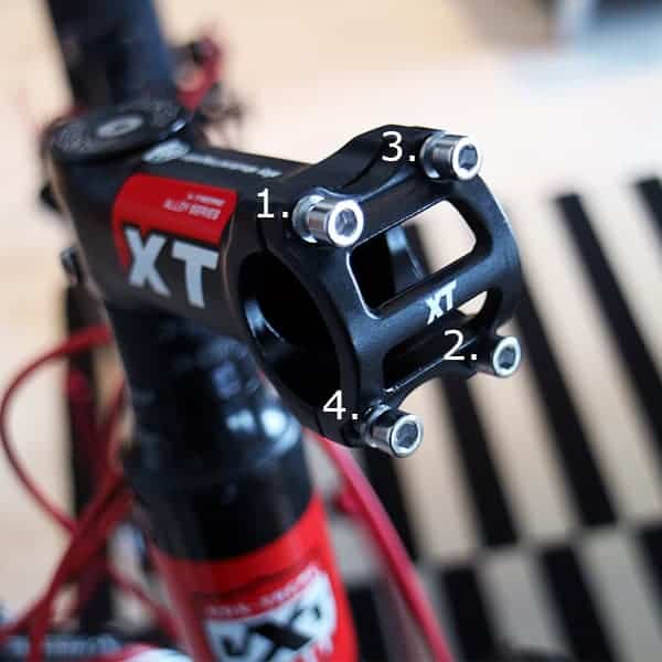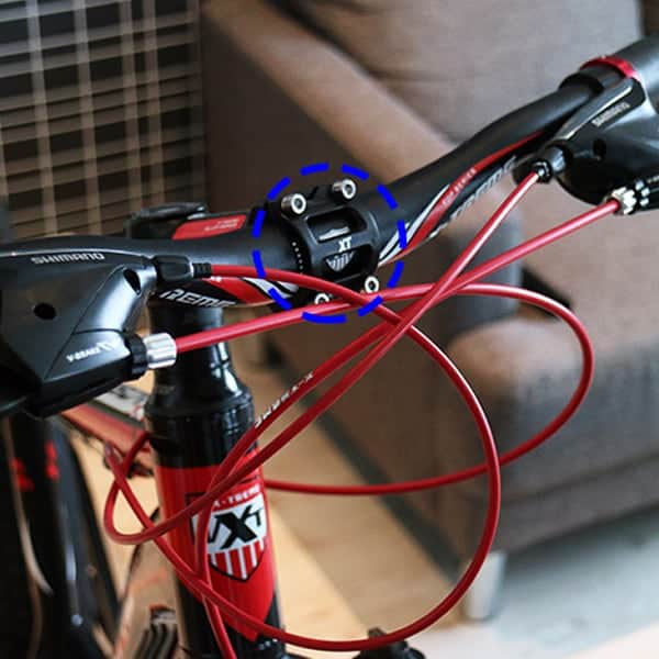 2. Aseta ohjaustanko paikoilleen niin, että kaikki johdot ovat edessä. Tangossa ja kiinnitysosassa olevat logot tulisi olla päällekkäin, kuten näet allaolevassa kuvassa sinisellä merkatun ympyrän. Tämä on optimaalinen asento, mutta toki voit säätää sitä haluamallasi tavalla. Kiinni neljä pulttia paikalleen ja tiukalle. Varo kuitenkin ylikiristämistä, etteivät pultit pääse katkeamaan. Et halua, että kovassa vauhdissa tanko kääntyy ympäri.
